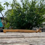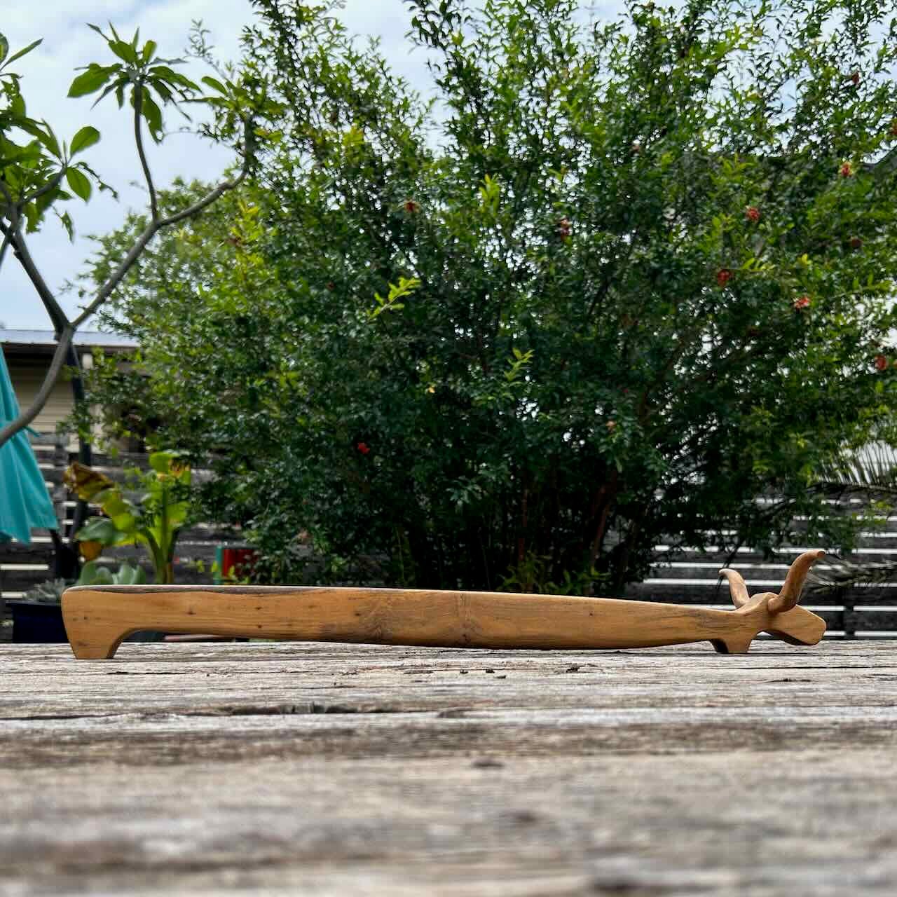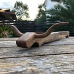 Longhorn sculpture on what I think is spalted pecan. 27.5” long with just under 11” horn span. Very light satin finish. Great, exaggerated lines and stance on this piece that would look right at home on a credenza, mantle or table.