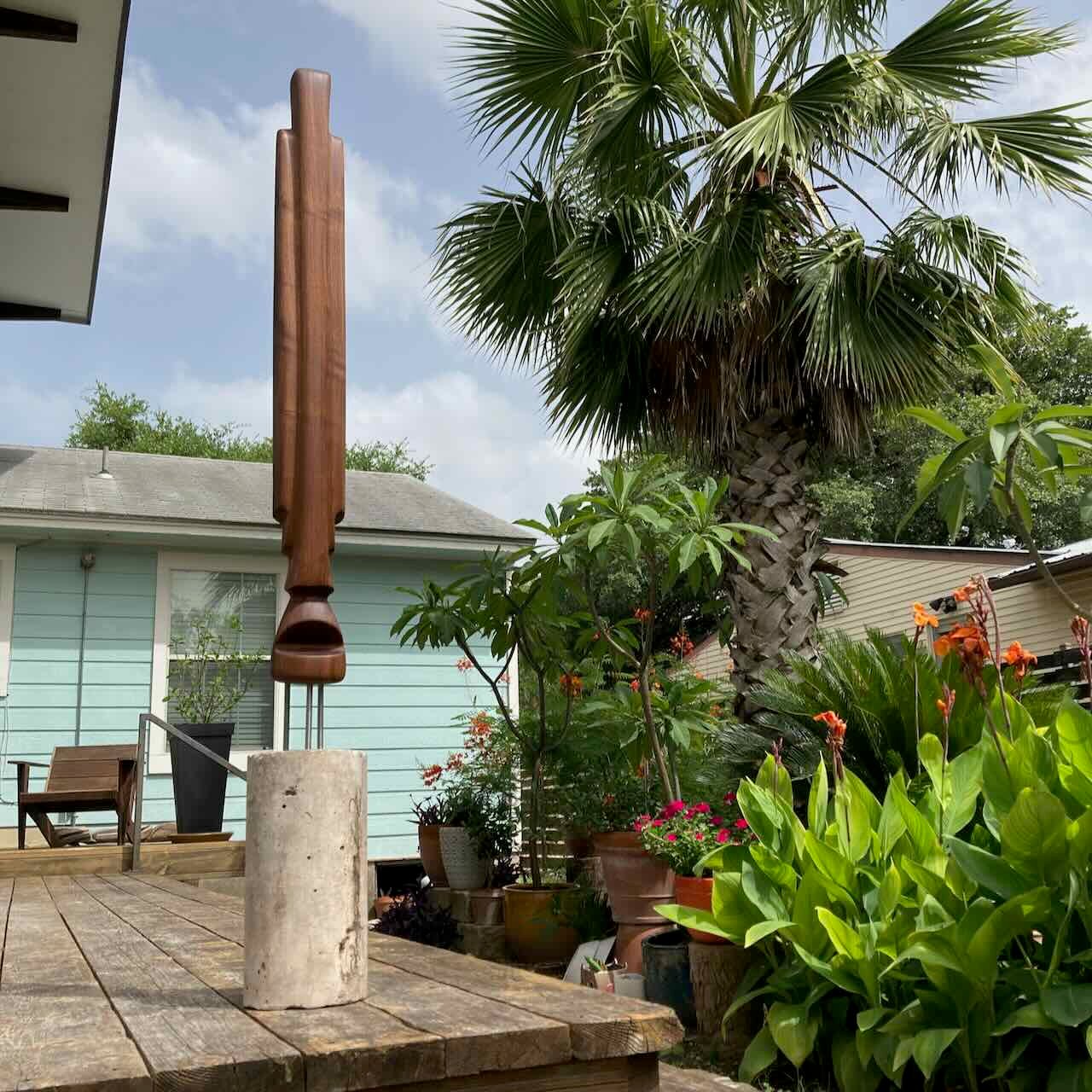 New midcentury-style abstract/tiki walnut carving, mounted onto an old cylindrical concrete base. 52” tall including the base (tiki is 36”x4"). Please contact for detailed photos. Free pickup also available in Austin, Texas.